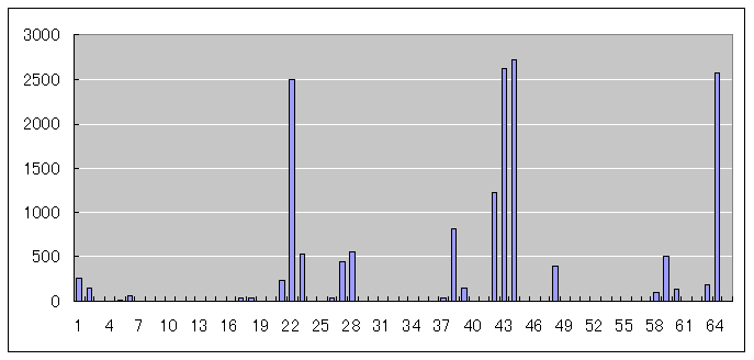 この演習で求めるヒストグラムの一例を図に示す.横軸が色の番号であり,縦軸が各色の画像中での出現頻度である.