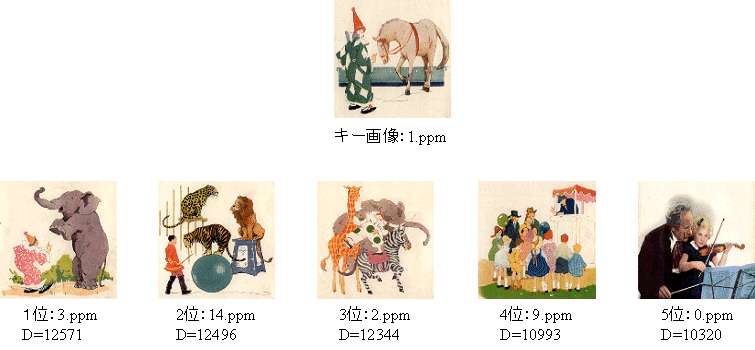 自分の検索結果が正しいかどうか検算できるように,サンプル画像として1.ppmを選んだ場合の上位5個の画像を以下に示しておく.Dはインタセクション値である.