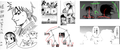 日本が生んだキラーコンテンツの一つにマンガがあります.マンガは一般に手書きで描かれたキャラクタがコマの中で自由に動き回り,その考えや感情はセリフによって表現されています.また,ストーリーの展開を追うことや,通常ではありえない時間的・空間的な飛躍があっても,人間はその内容を理解し,楽しむことが可能です.別の見方をすると,マンガは種々雑多な記号の集合であり,人間はそこからさまざまな情報を読み取ることができます.本研究室では,このような現象を工学的に説明すること,および自動解析によってマンガというメディアの新たな可能性を探ることを目的として,原作者や出版社のご協力のもと,実際に連載中の作品を対象としたマンガの機械解析に関する研究を進めています.