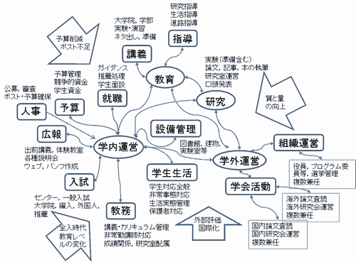 大学の教員ってどんな仕事をしているのですか?とよく聞かれます.しかし,一言で答えることは難しいのです.それは以下の図のように,業務内容が多岐に渡っているからです.