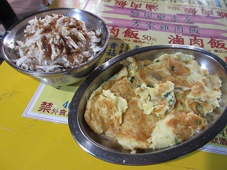 特に夜市で美味しかったグルメは、以下の写真の魯肉飯とネギ入り卵焼きです。