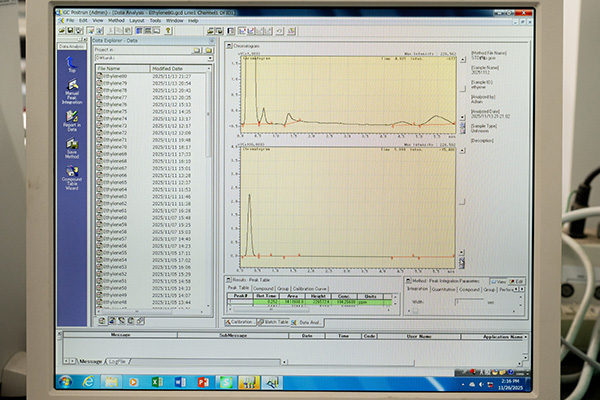 ガスクロマトグラフにより「P25」を塗布した基盤のエチレン分解量を定量また、品質変化に関与するエチレンに着目し、酸化チタン光触媒(P25)を固定化したモジュール等を用いたエチレン分解・制御技術を開発しています。本研究室の強みは、フィールド調査、ラボ実験、数値解析を組み合わせ、技術導入の効果を多面的に検証できる点です。こうした知見を統合し、流通条件に合わせた品質管理技術を提示することで、国内およびアジア地域の流通課題の解決に貢献することを目指します。英語での研究発信や国際学会での成果共有を通じて、グローバルな視座を身につけられる点もこの研究の面白さだと思います。