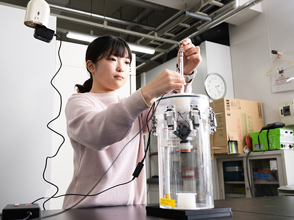 大学院修士課程では、自作したエチレン分解デバイスをUV(紫外線)以外の波長の光にも反応するように改良するのが目標です。将来は食品流通の仕事などに携わり、食品ロス削減に少しでも貢献したいと思っています。