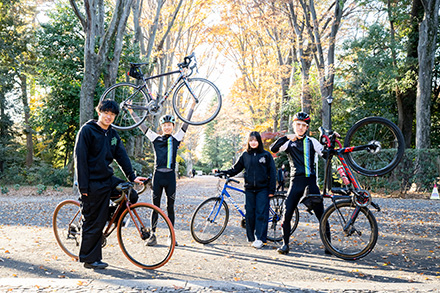 部員の服装もサイクリングウェアを着用する本格派から運動できるラフな格好で気軽に楽しむ人までさまざま。自転車についてはスポーツタイプという条件はあるものの、安価なものから数十万円するものまで自由に選択できます。旅行好きな人や運動神経に自信がないけれどスポーツを楽しみたい人など、幅広い新入部員をお待ちしています!