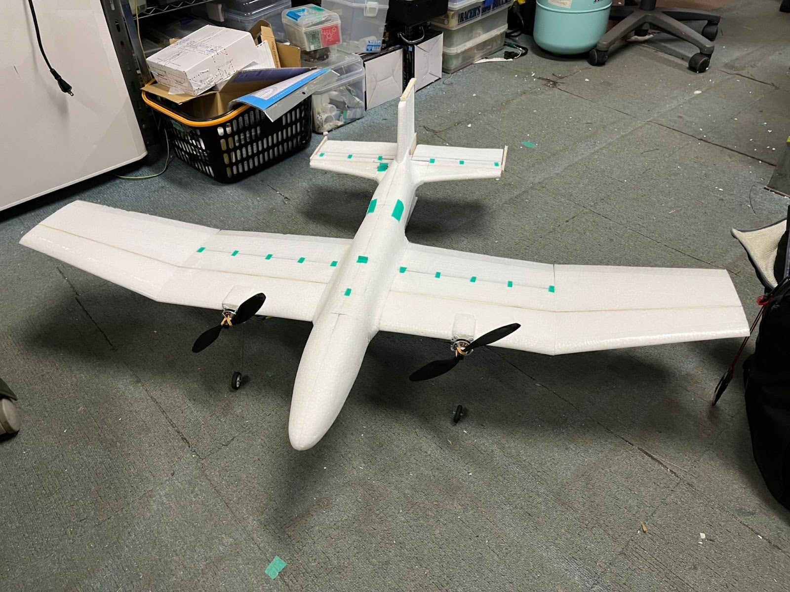 自動操縦装置非搭載時は181gと軽量で、積載量に余裕がある。6軸センサーを重心位置に搭載する都合上、投下装置を左右の翼下に取り付けることになったが、軍用機っぽくてかっこいい。