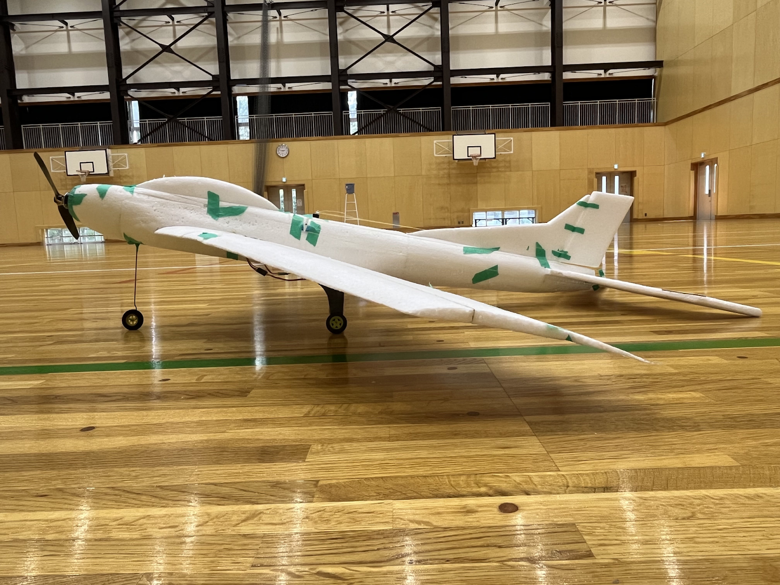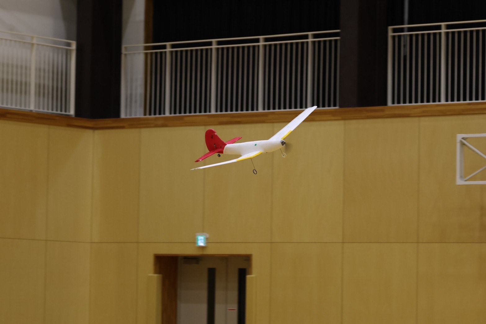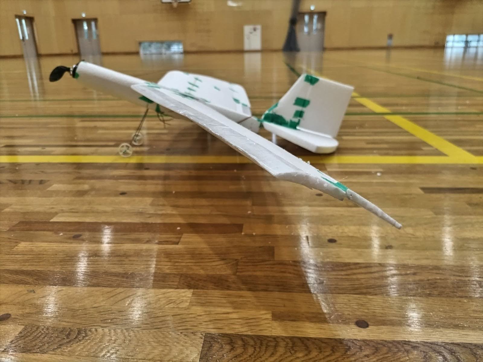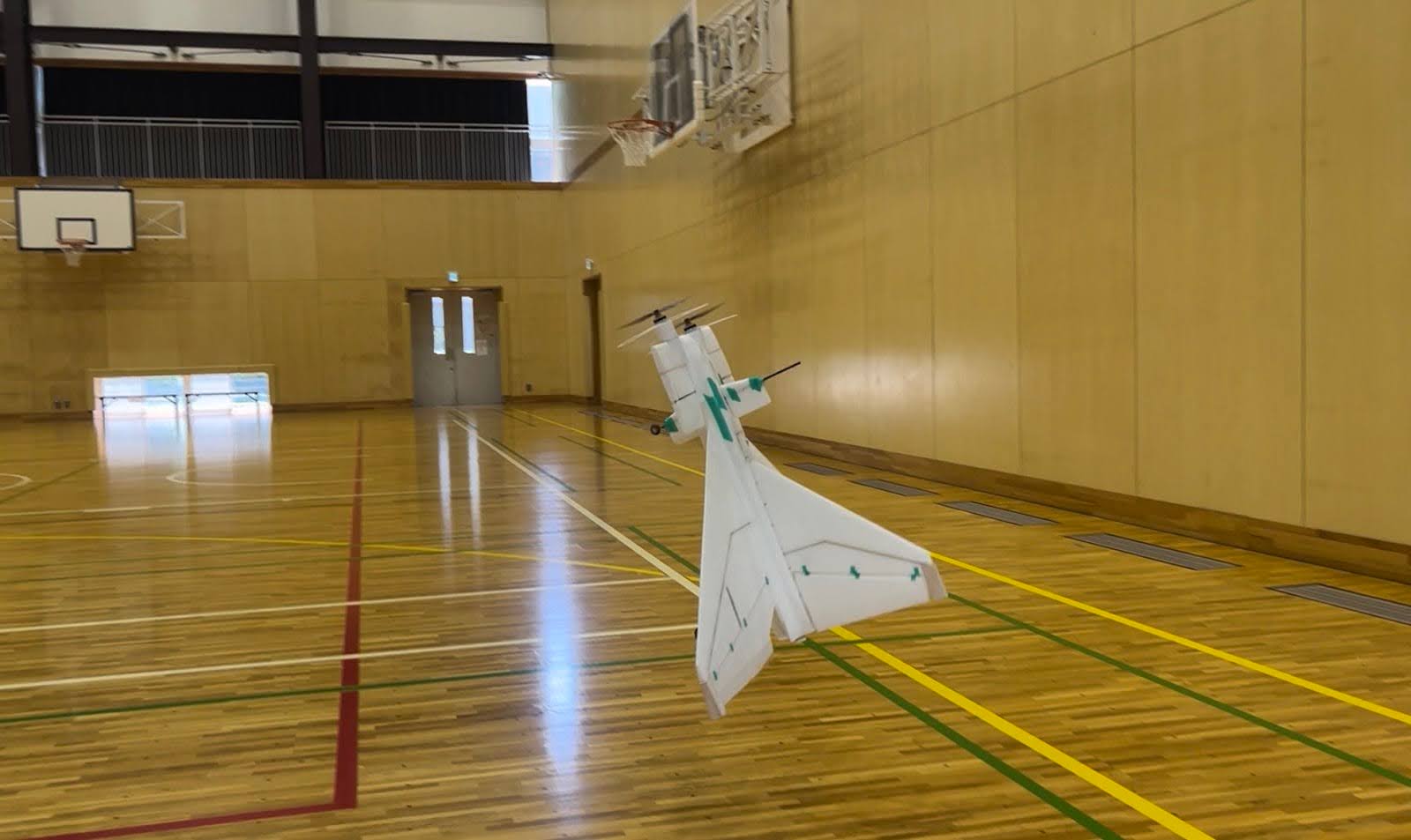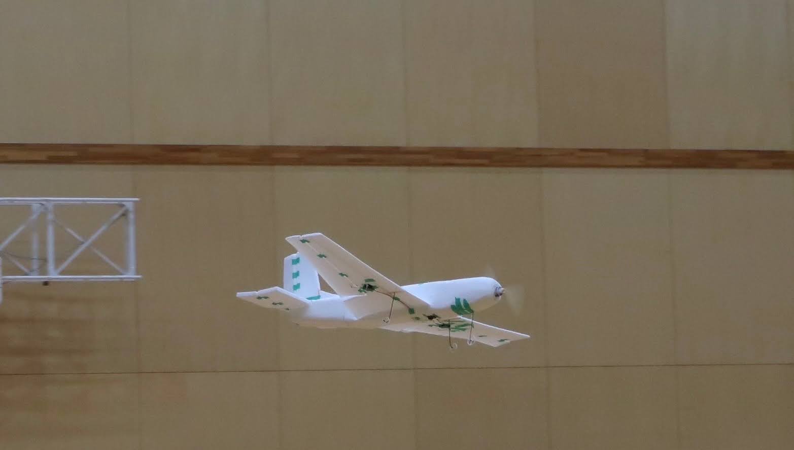 従来グライダーの試験は地上からの手投げで行っていたが、体育館の天井ギリギリから行うことを可能にした。