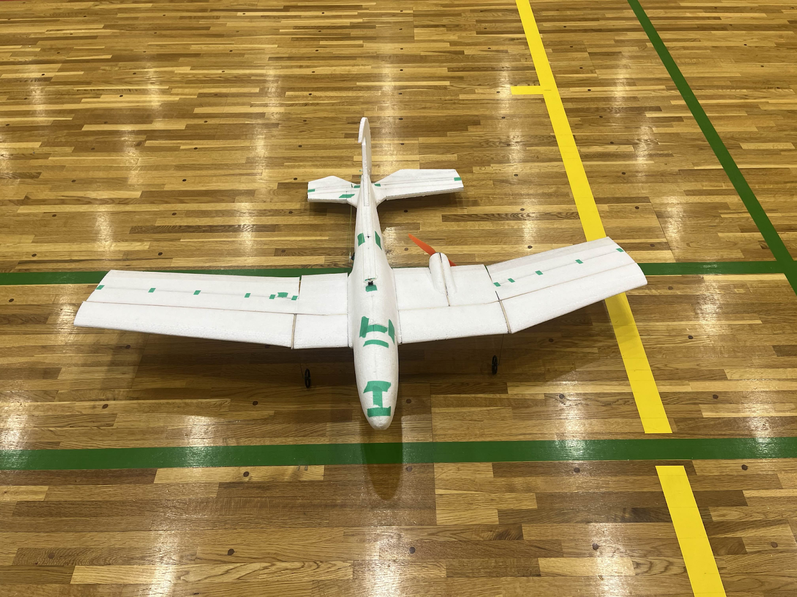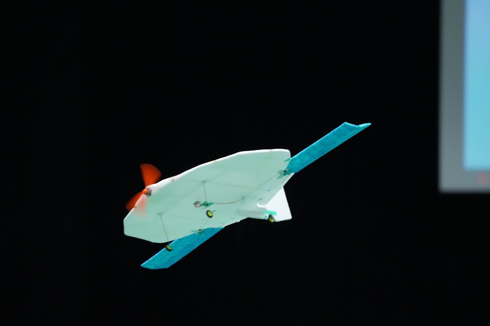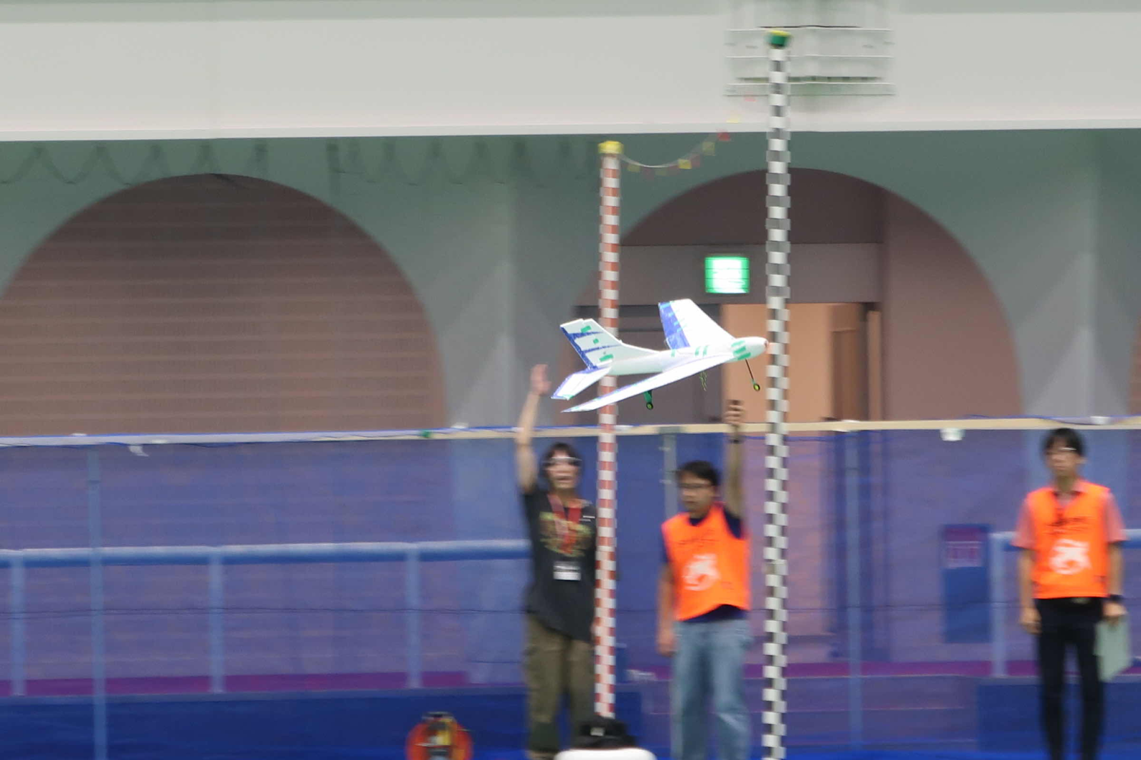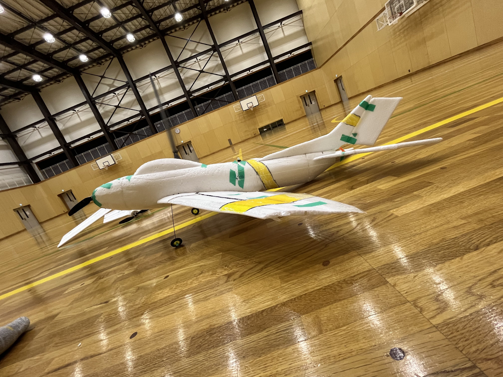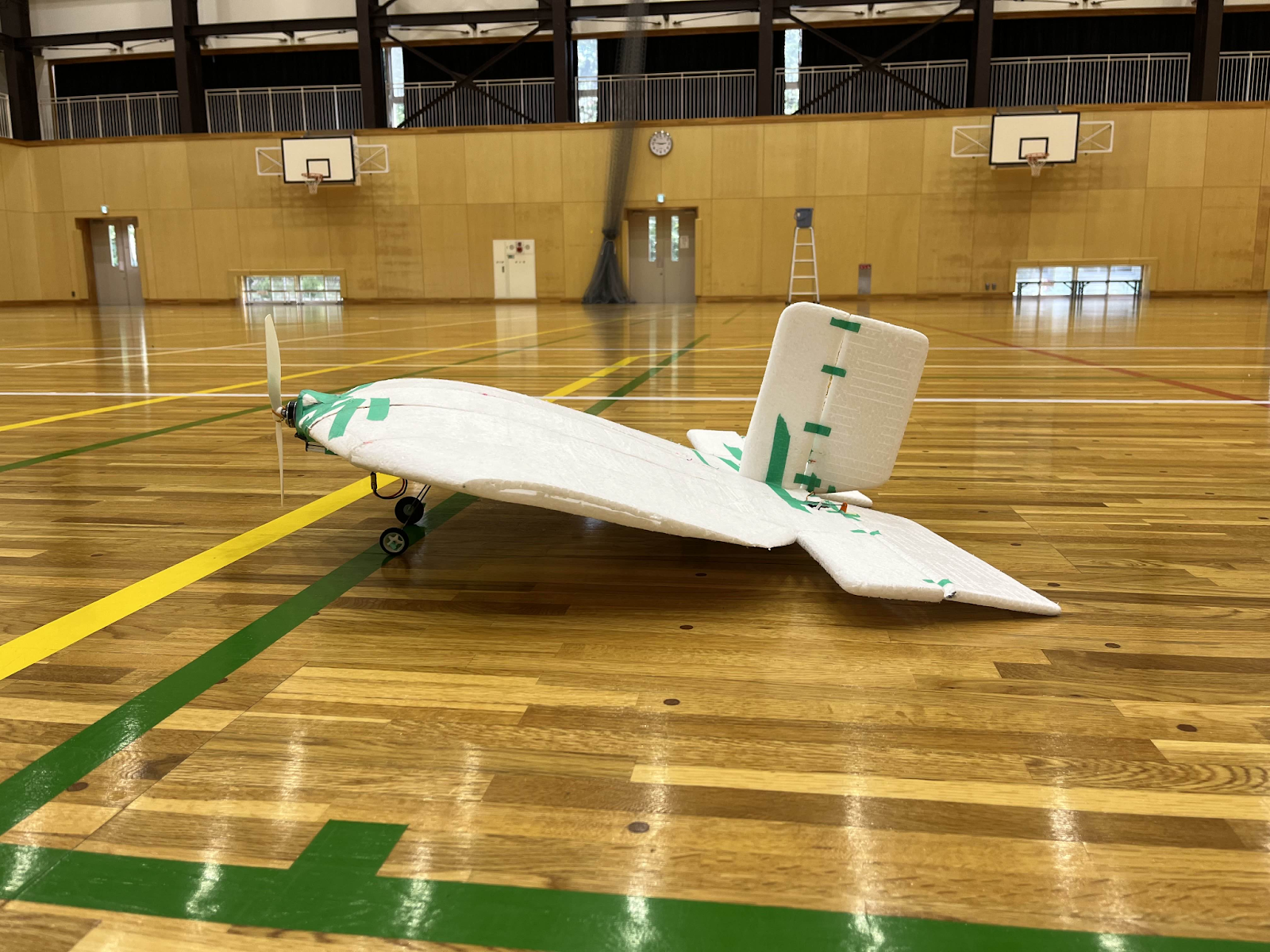 従来グライダーの試験は地上からの手投げで行っていたが、体育館の天井ギリギリから行うことを可能にした。