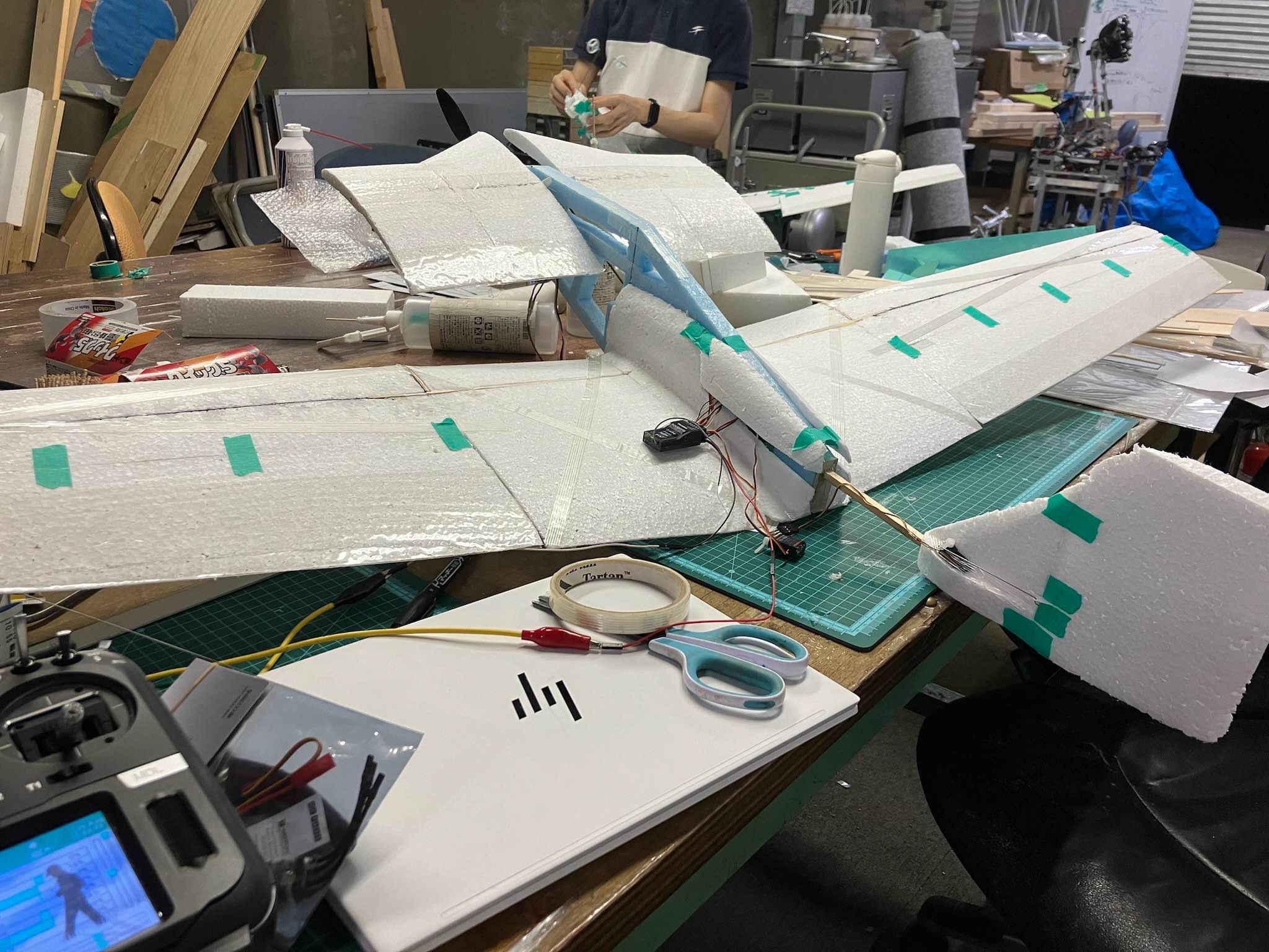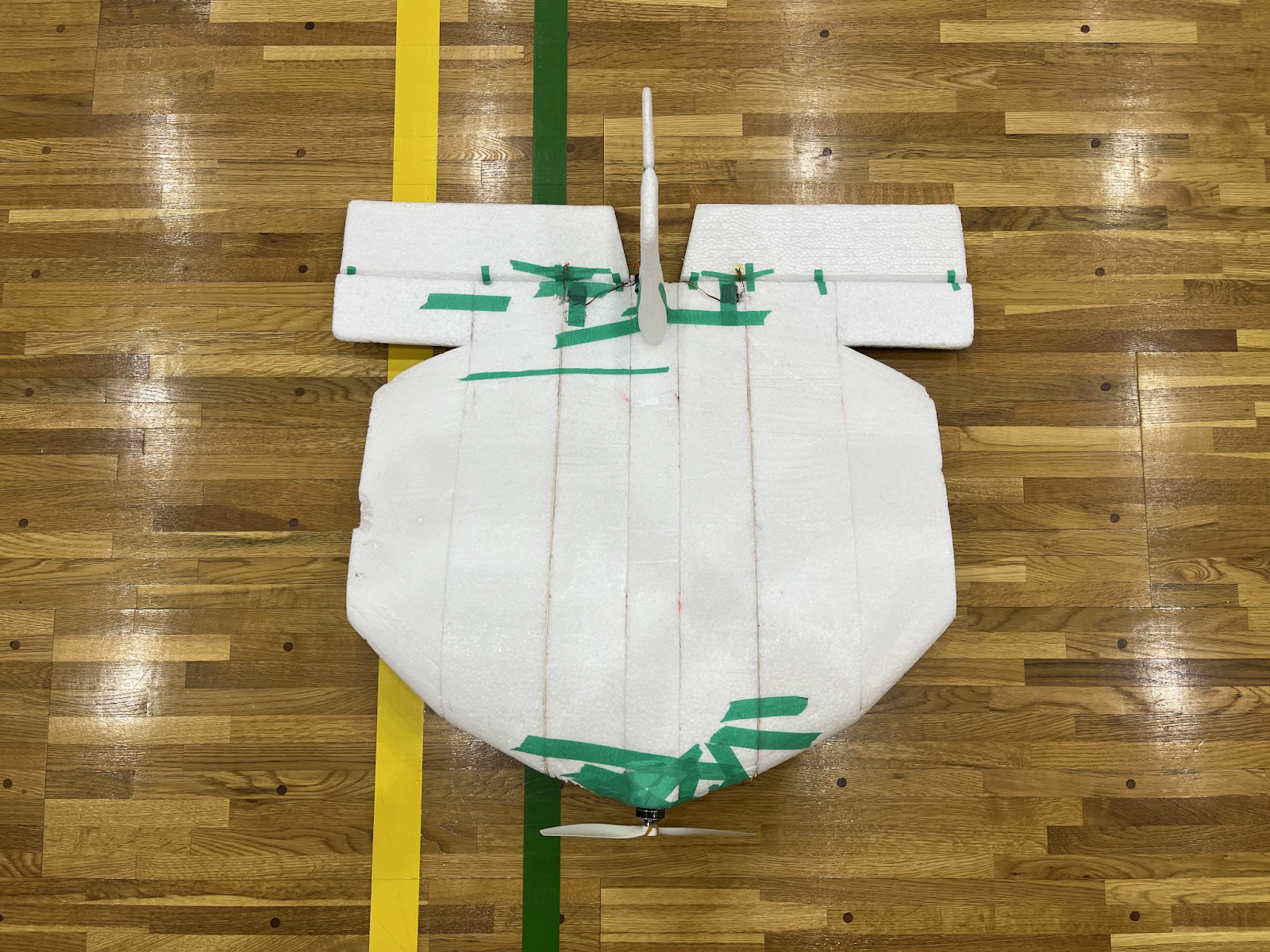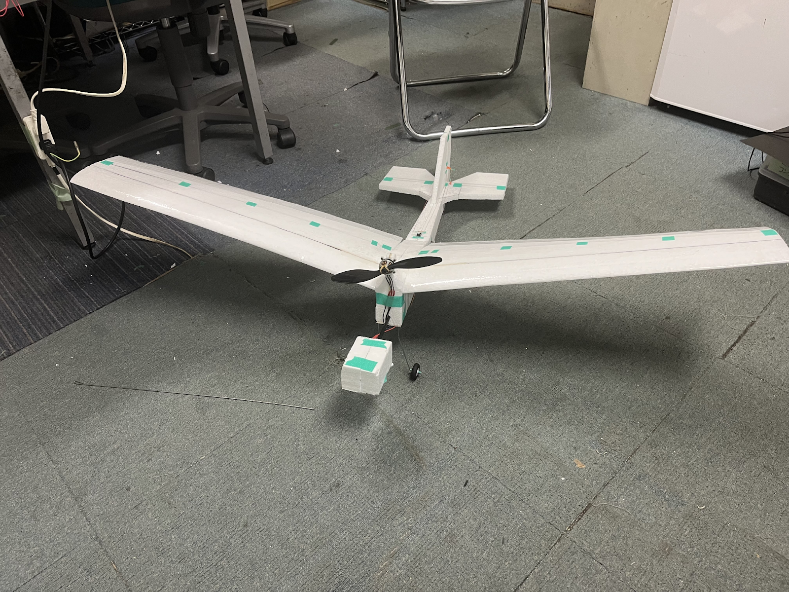 当時部長の発案から始まった機体。プロペラガードが発泡スチロール、機体フレームはバルサ、一部がプリンターパーツという異色な構成。