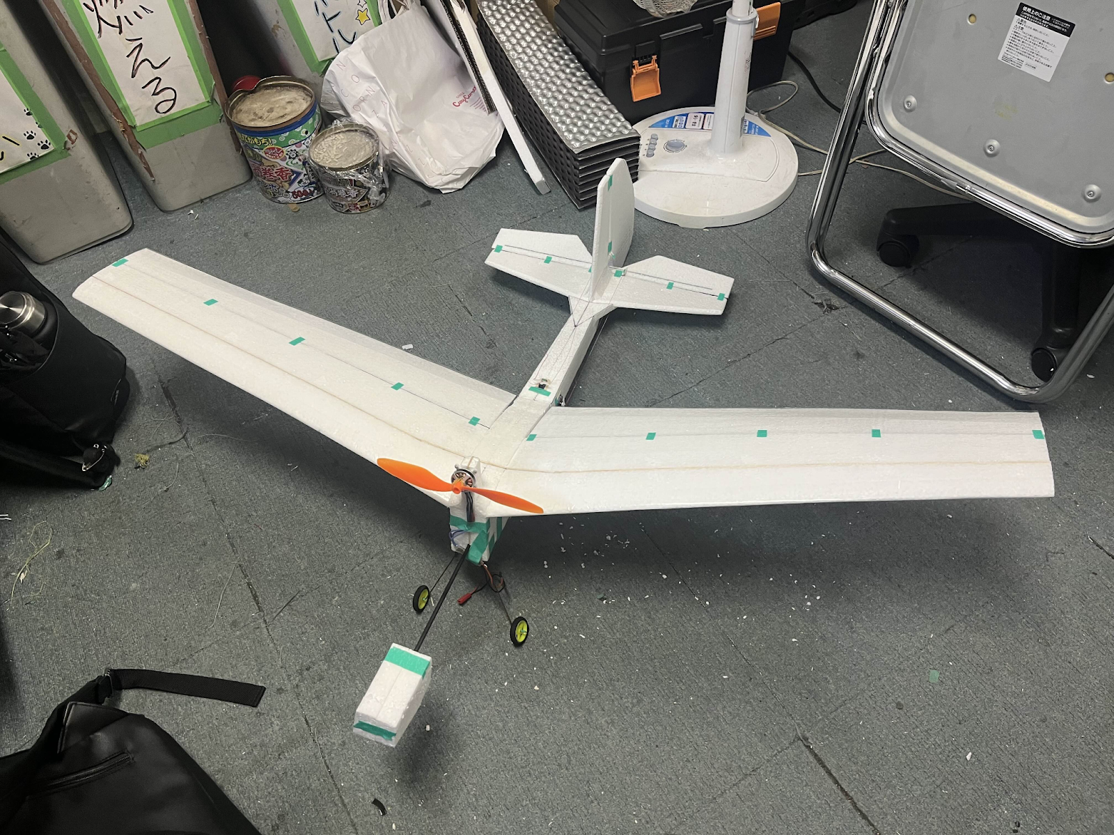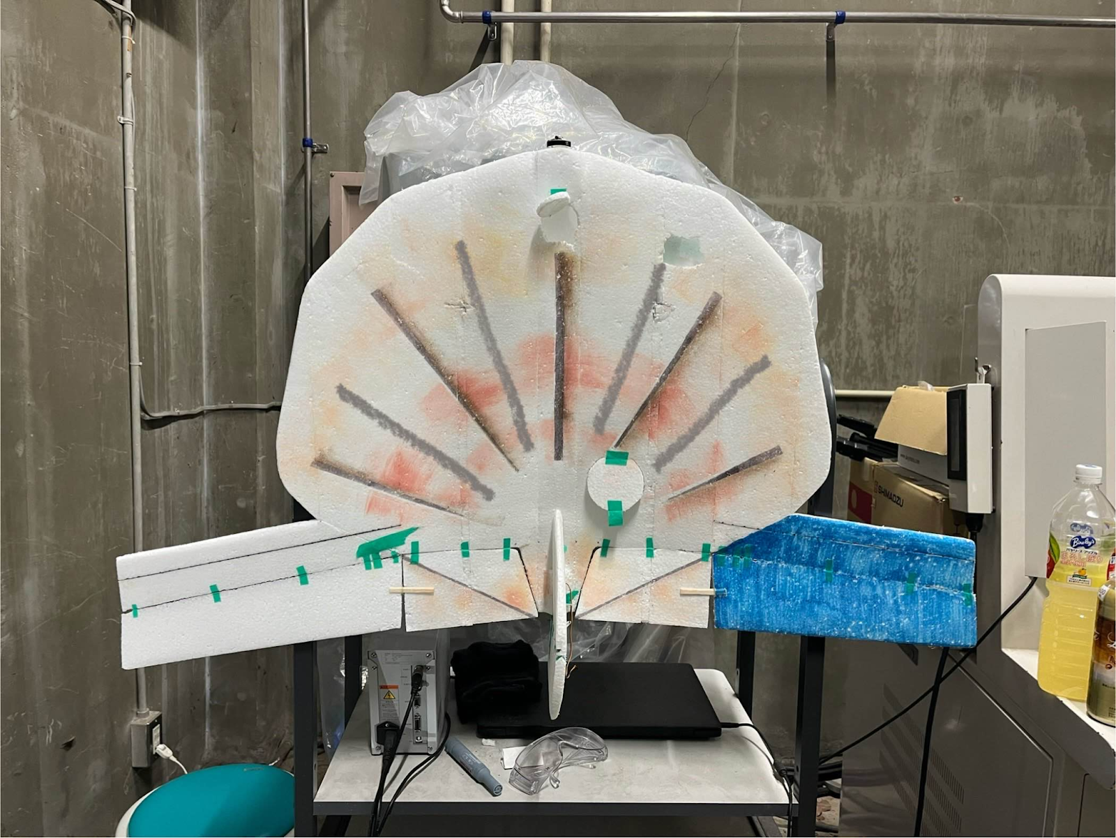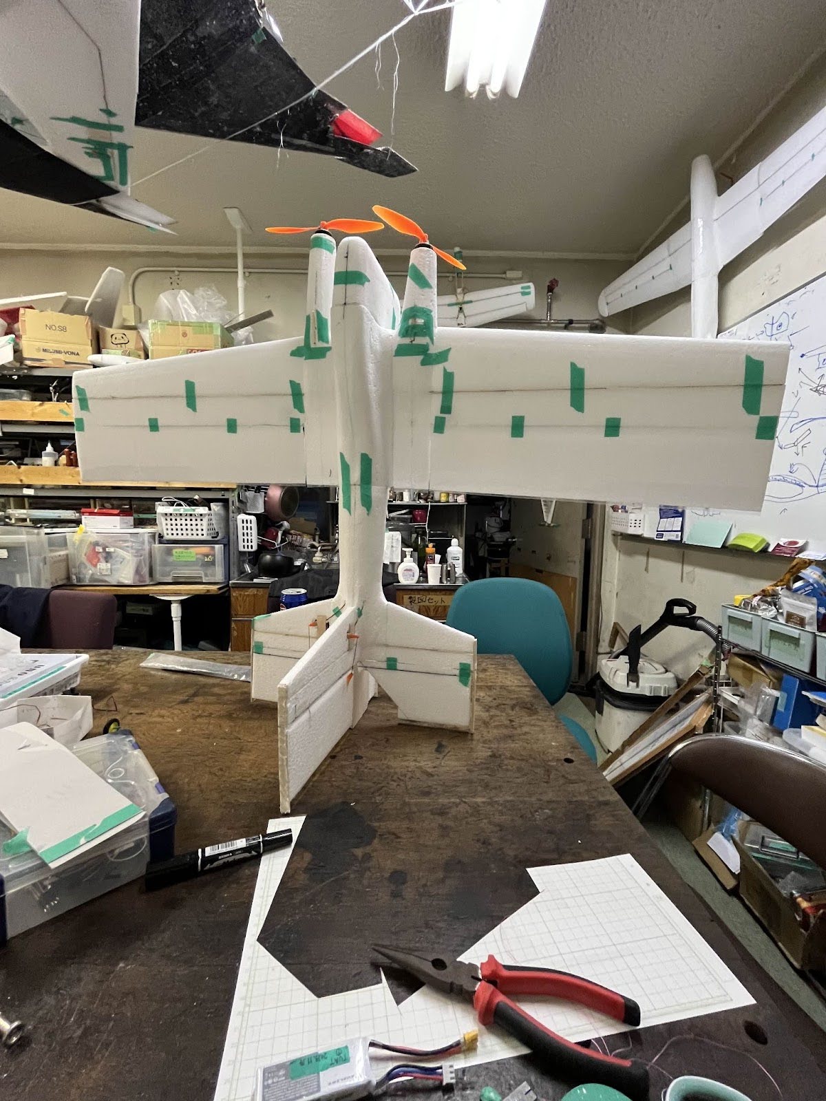 当時部長の発案から始まった機体。プロペラガードが発泡スチロール、機体フレームはバルサ、一部がプリンターパーツという異色な構成。