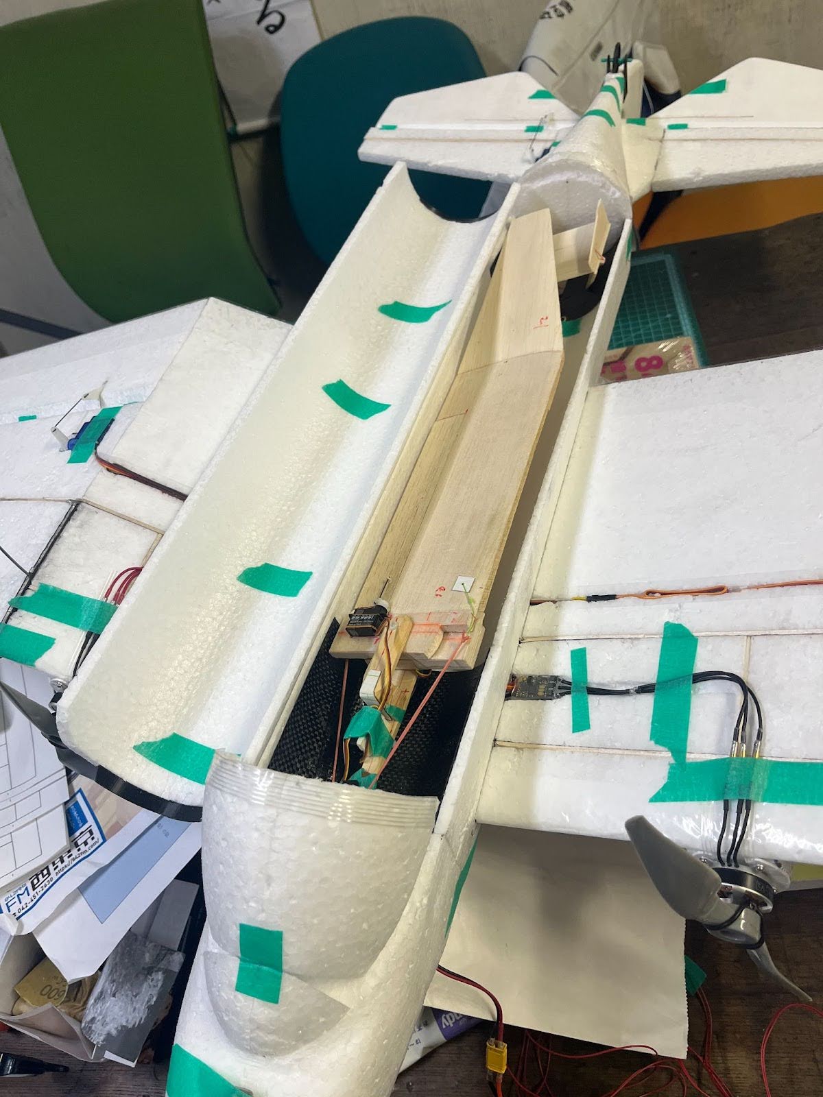 狭い機内に大型のサーボを2つねじ込み、リンケージと配線が干渉しないギリギリの状態で配置されている。