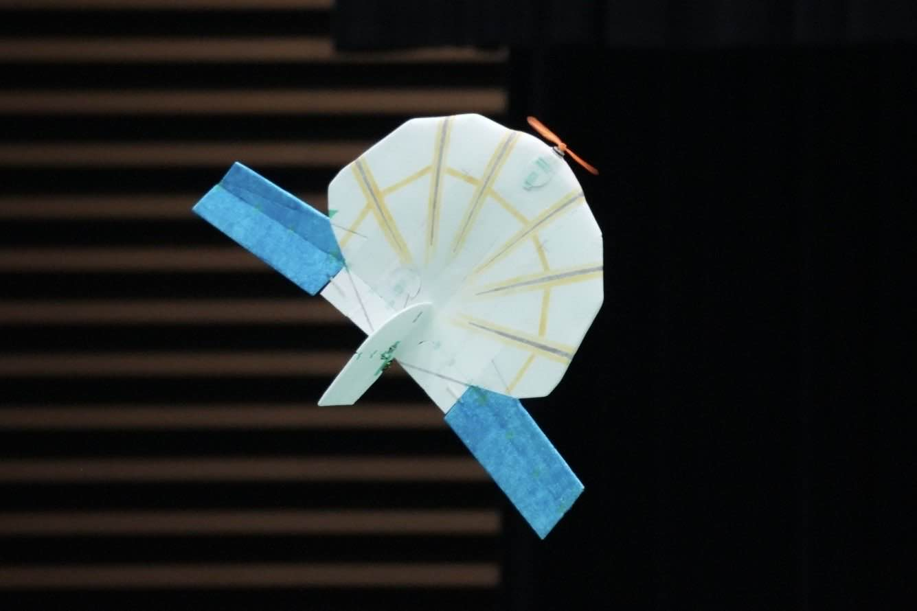 航空法の制限を受けない100g未満を目指して製作された機体。胴体にカーボンを使用し最終的にリポを積んで90gにおさまった。