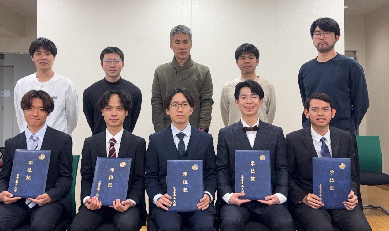 - 卒業式が行われ、M2の河田くん、東井くん、山口くんに修士号が、4年生の佐藤君とフィルマン君に学士号が授与されました。個性豊かなメンバーで研究室を盛り上げてくれました。今後の活躍を期待しております!