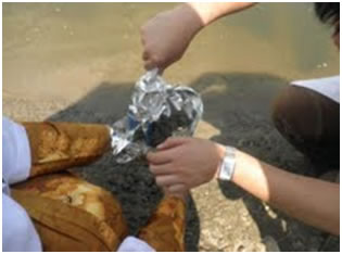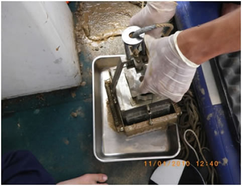 | Fig.6: Using Eckman Dredge Sediment Sampler to take the surface sediment in river (5 cm). |