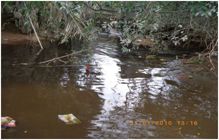 | Fig.3: One of our sampling point which located near to the discharge of leachate from Sungai Sedu landfill in Kuala Langat area (colour of river water changes to blackish colour). |