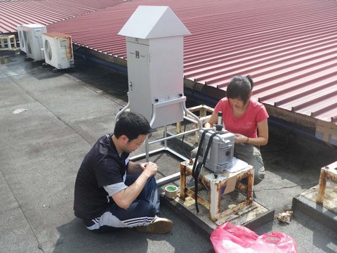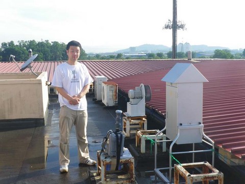 Dr. Pauzi picked us to UPM. Members in front of the office. Where to install air sampler...and hard work to equip the sampler on the roof.