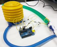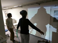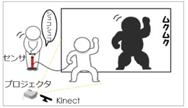 本テーマでは,本来厳密に1対1に存在ししている物体(人)と影の関係を拡張し,影と相互作用(インタラクション)できるシステム(デプシス)を実現することを目指しました.つまり,見た目は人の影ですが,一部はコンピュータが作り出した仮想の影で,ホースをもった体験者(影を作り出す人)に別の人がホースに繋がったポンプに空気を注入するとそれに合わせて影を膨らませることが出来ます.人の体の周辺に仮想の影をマッピングするために深度カメラ(Kinect)を用いて骨格検出を行い,空気ポンプの注入状況を測るためにホース内にマイクロホンを設置しています.ポンプの動きという実世界の動きが仮想の影に反映され,それがポンプを動かす人に影響を与えるという点で,実世界と仮想世界の相互作用を実現した例です.