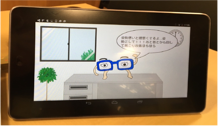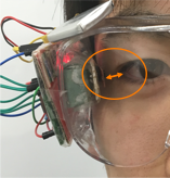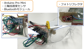 本テーマでは,眼鏡型デバイス(めがねくん)によりデスクワーク中の健康状態管理を自然な状態で可能にすることを目指しました.化学実験用ゴーグルに,瞬きを計測するためのまぶたの動きに伴う距離変化を検出するフォトリフレクタと,頭部の動きを検出するための3軸加速度センサ,制御用の超小型Arduino(Pro mini),スマートフォンとの連携のためのBluetoothモジュールを搭載しており,眼鏡単体で計測が可能です.検出した瞬きや頭部の動き情報はスマートフォンに送信され,仮想のキャラクタ(めがねくん)が利用者に休憩や首を回して凝りを和らげることを促すメッセージを出します.