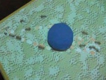 本テーマでは,プロジェクタで机上に投影されたアリの群れのアニメーションに,障害物を置いたりエサをやるといった現実世界で見られる操作を加えることで仮想世界と物理世界とのインタラクションを実現します.巣穴から出たアリはエサを見つけるとフェロモンを残して巣穴に戻ります.それを検知した他のアリが次々と集まりだし,やがて「仮想アリの道」ができます.この道は,障害物(カラー粘土塊)を置いてもそれを回避するように再生成されます.さらに,ルーペを置くと,ルーペ内部のアリの像が拡大表示されます.障害物や餌を載せたスプーン,ルーペは物理世界に存在する物体ですが,それらの種別や位置の特定はマーカーを使わずに物体そのものを認識することで実現しているので,より自然な状態を表現することが出来ます.