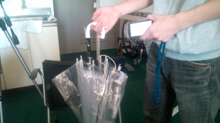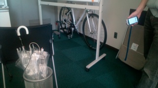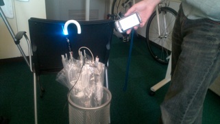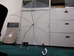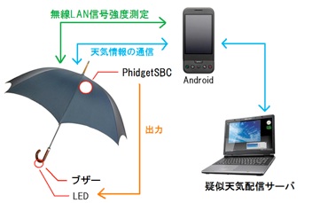 本テーマでは,既存の日常物に新たな価値を付加するというコンセプトに基づき,傘に知覚・出力(I/O)機能を付加しました.傘は持ち歩いていることが分かるように加速度センサと,携帯電話(Androidスマートフォン)との連携および携帯電話との距離を電波強度から推定するためのWiFiモジュール(シングルボードコンピュータ:PhidgetSBC)が搭載されています.