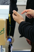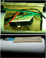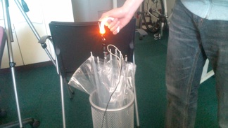 本テーマでは,日常空間に浸透したモノを用いた情報伝達を目指しました.ネット上に存在する情報源(天気予報)とデバイスが存在する空間の状態(温度,湿度)をもとに警告内容を決定し,本物の風鈴の音や風鈴に設置されたLEDの色や点滅により,警告を伝達します.外部の制御用PCを必要とせずに,風鈴自体がネット上の情報取得,温度/湿度センサからのデータ取得・解析を行い,制御を行います.また,ユーザの詳細情報取得要求を考慮して,自動提供・手動取得という2段階のインタラクションを提供します.手動取得はユーザが風鈴の音や点滅の詳細を知りたい場合に,スマートフォンを通じて取得することを可能にするもので,風鈴自体の短冊に印刷されている2次元マーカー(QRコード)を端末で読み取り,風鈴へのアクセス情報を得て,端末のWebブラウザで詳細情報を閲覧します.風鈴にはArduinoが搭載されており,ミニWebサーバが搭載されています.また,風鈴の中の玉はモーターにつながっており,任意のタイミングで音を発生させることが出来ます.