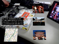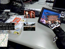 右図のようにお土産には,それを識別できるマーカーがつけられており,購入した時間や場所を関連づけることができ,コンピュータ上で管理することが出来ます.このお土産を中央にあるようなHMDを通じて見ると,その土産を買った場所の地図やそこで撮られた写真などが近くに重ね合わさった状態で見ることが出来ます.マーカーの処理と情報表示はARToolkit+OpenGLを利用しています.