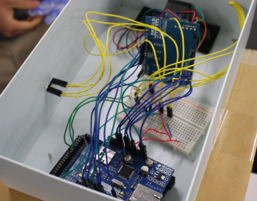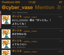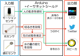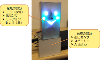 本テーマでは,Internet-of-Thingsの一例として, 花瓶に生けられている花に愛着を持ってもらうために, 花瓶が自身の状態をセンシングしてインターネット上の人間とコミュニケーションをするシステムを開発しました.光量や水量が十分でないと,花瓶はユーザが接近したときに震動したり表情を形成するよう配置されたLEDが点灯して通知し(実世界でのユーザとのインタラクション),Twitterを通じて自身の「心情」を呟きます(仮想世界でのインタラクション).このようにあ,デジタル化しTwitterというインフラに統合することで人とモノのコミュニケーションが成立します.システムは,ArduinoにEthernetシールドを搭載しているため,中継のPCなしにモノ単体で動作可能です.