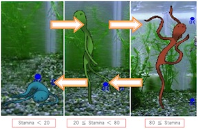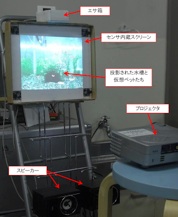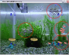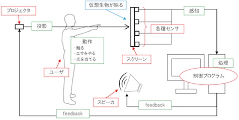 たまごっちのような仮想ペットは電子デバイス上に存在しますが,インタラクションの手段はボタンを押すような単純な動作に限られています.このテーマでは,仮想ペットが存在する物理オブジェクトをたたいたり,明るさを変えたりといった実世界で発生したイベントを入力として,仮想ペットを制御します.下図のように,プロジェクタを通じて水槽と仮想ペットの映像をタスクリーンに投影します.物理世界とのインタラクションを実現するために,タッチ位置を最大73分割して取得できるスクリーンを開発しました.同種の仮想ペットはBoidアルゴリズムにより自律的に群れを形成して移動しますが,スクリーンをタッチすると群れの形状が変化します.