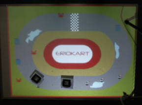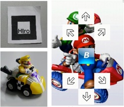 本テーマでは,物理世界を走るラジコンカーと仮想空間が作り出す情報の融合を目指しました.システムは,ラジコンカーが走っている場所を認識して(便宜的にラジコンに視覚マーカーを貼付),プロジェクタを通じて仮想的な氷や悪路を作り出します.すると,それに応じてラジコンカーがユーザの操作とは別に振る舞いを変えます(例:スピンする,コース外に出ようとすると止まる).ラジコンカーとしては,赤外線リモコンで制御できる「チョロQハイブリッド」を用いており,前進・後退・停止・左右の操縦に必要なリモコンコードを学習することで,自作のプログラムからコントロールできるようになっています.