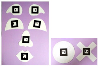 本テーマでは,「デジタルな遊び(ビデオゲームなど)」と「アナログな遊び(伝統的な遊び)」 の 2 つの遊びの形態を融合した,どの世代でも楽しめるようなツールを開発することで,あらゆる 世代の人でも楽しみつつ世代を越えたコミュニケーションを取ることを目指しました.本システムの特徴は,自分自身の顔の画像(またはあらかじめ用意した任意の顔画像)を用いて福笑いをすることができる点にあります.通常の福笑いに見られる紙のパーツを手で配置する際の手触りを残すことを重視して,a)のような各パーツを用意してあります.パーツには一意に識別可能なように可視マーカがつけられれており,位置と方向を机上のカメラを通じて認識します.紙パーツの配置結果は,あらかじめ取り込みパーツ部分を除去して肌色で塗りつぶしておいた顔領域上に,配置され平滑化処理されます.
