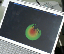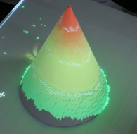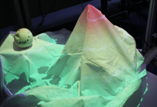 本テーマでは,動的なプロジェクションマッピングを目指しました.東京駅に代表されるプロジェクションマッピングは事前の詳細な投影位置決めが重要となりますが,時間がかかる作業となるうえ,形状が時々刻々と変化する物体には対応することができません.本テーマでは,深度センサを用いて取得した物体形状の情報をもとに投影内容を変化させます.すなわち,高さに応じて投影する色を変化させます.また,プロジェクタの性質上,距離が離れるにつれて投影がそのサイズが大きくなり狙い通りの位置に指定した色を出力することが出来なくなるので,距離に応じて画素数を変化させています.