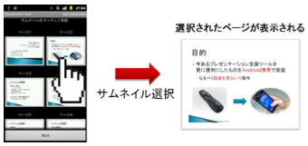 本テーマでは,スマートフォン(Android携帯)パワーポイントを用いたプレゼンテーションを支援することをめざしました.現在でもレーザーポインタにスライド送り機能が合体した製品が販売されていますが,本テーマではページ送り戻しや指示棒機能 (a) といったそれらに共通の機能に加えて,残り時間の通知(b)や特定ページへのジャンプ(c)などディスプレイとタッチ入力といった高機能なスマートフォンのUIを生かしたものとなっています.また,発表時の聴衆に与える印象も考慮して,誤タッチや端末画面の注視をしなくても済むような操作性を目指しました.あらかじめ,パワーポイント資料をJPEGで画像として保存して,Android端末側に保存しておくことで,サムネイルを見ながらスライドのジャンプを迅速に行うようにすることで,画面の注視時間を減らすようにしました.なお,本テーマの成果物は, 東工大・像情報工学研究所および(社)映像情報メディア学会主催のモバイルアプリコンテスト2012にて優秀賞を受賞しました.