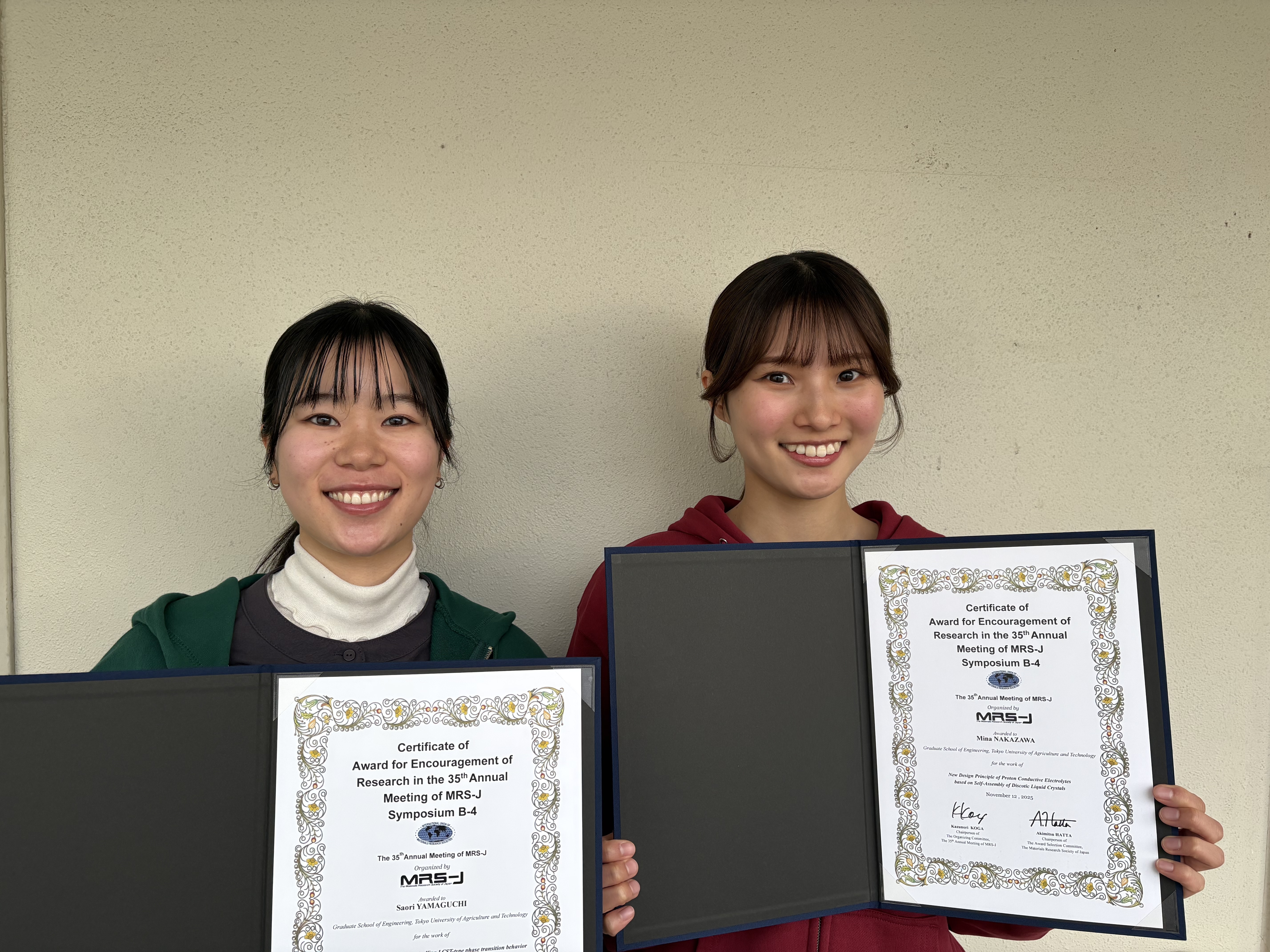 2026年1月13日 M2の山口 沙緒里さんとM1の仲澤 美奈さんが第35回日本MRS年次大会で奨励賞を受賞しました!二人同時とは、凄い!リンク