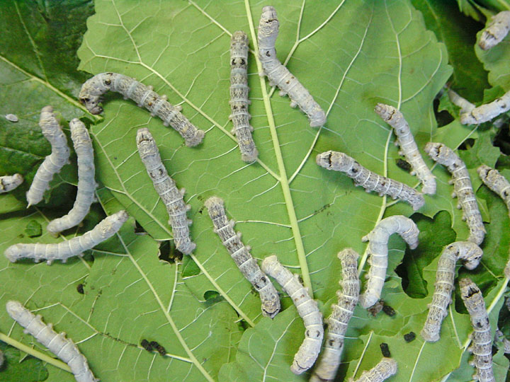 限性セーブル 普通の形蚕(白)が雄、セーブル(暗色)が雌<拡大> |