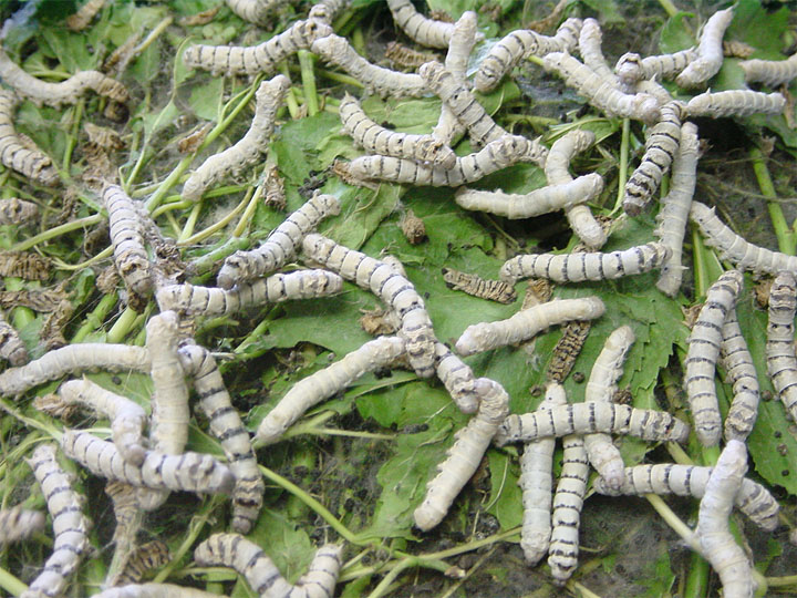 限性虎蚕 姫蚕(白,斑紋なし)が雄、虎蚕(縞模様)が雌<拡大> |