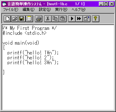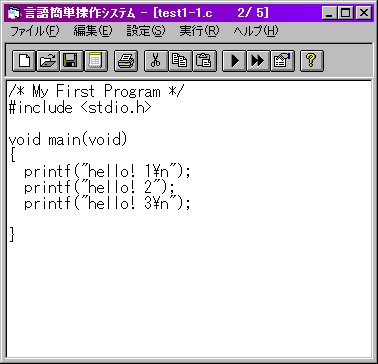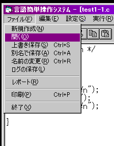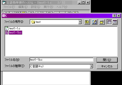 ウィンドウ上部に、言語簡単操作システム- [test1-1.c]と表示されたままであることに注意!!!