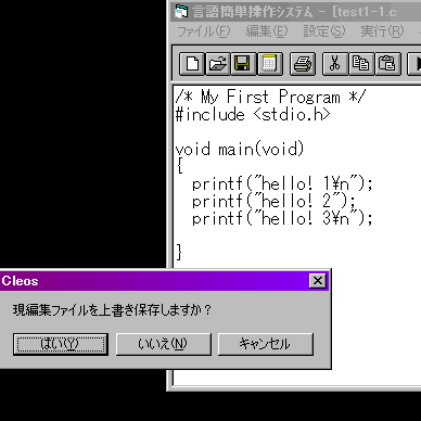 通常、エディタの類では、別名で保存した場合、元ファイル(test1-1.c)は変更されずに、新ファイル(test1-1b.c)の編集画面に設定されるものなのですが、CLEOSはそうではありません(仕様???)。したがって新ファイルtest1-1b.cを開かない限り、これから後の編集作業は再び元ファイルtest1-1.cに施されることになってしまいます。うっかり元ファイルを壊してしまわないよう十分注意してください。