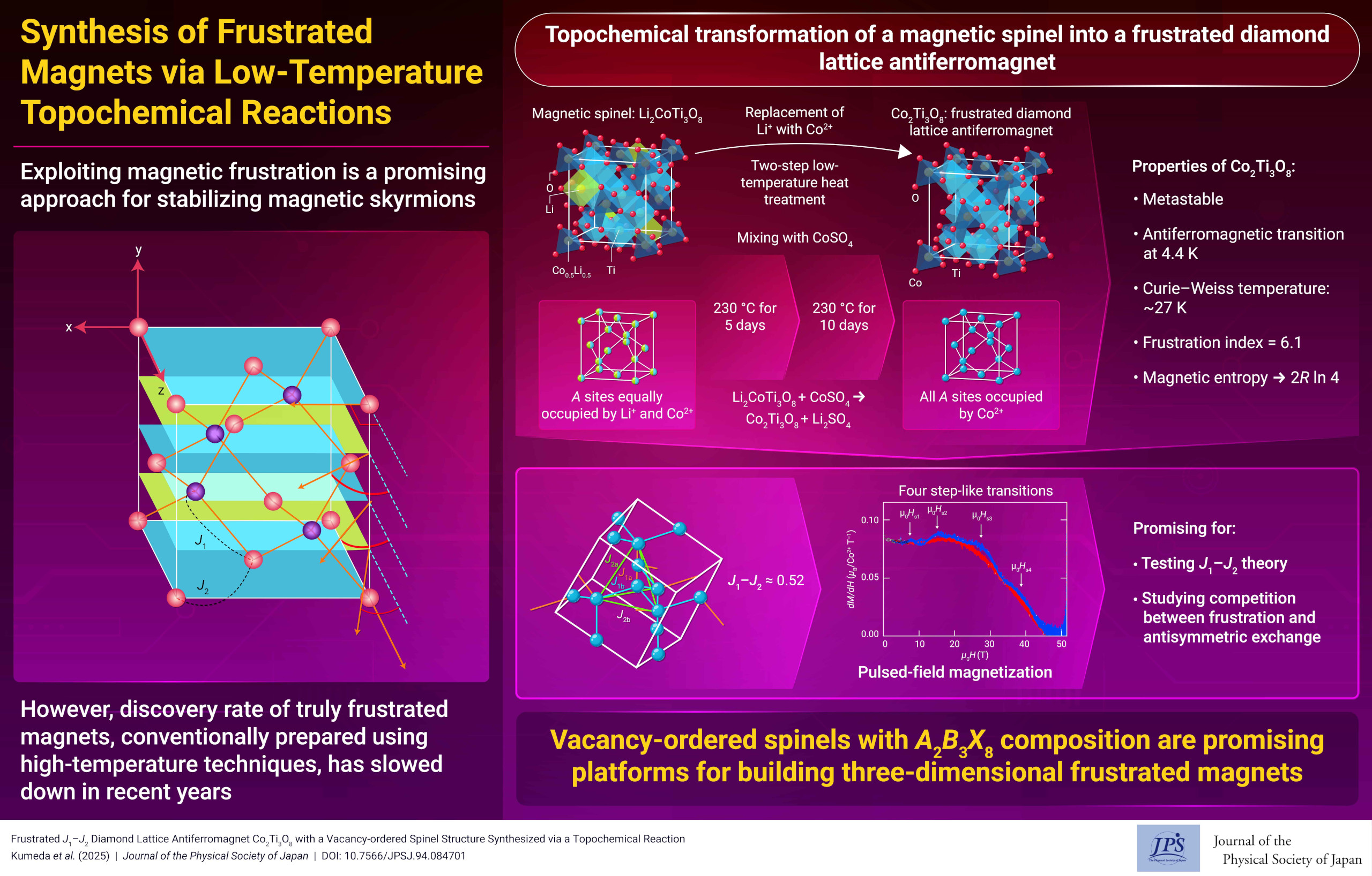 当研究室は、東京農工大学工学研究院化学物理工学科に所属し、無機固体化合物、特に磁性体の物性物理と化学を専門に研究しています。私たちが探求する「量子物質」は、電荷、スピン、軌道、格子といった基本的な自由度が相互に絡み合い、古典的な物理や低次元の量子力学では説明できない新しい準粒子を創発します。このような準粒子は、通常の巨視的な世界では見られない、独特で興味深い磁性や電子物性を示します。当研究室では、「低温反応による非平衡プロセス」を駆使した合理的な物質設計を通じて、新たな量子物質の開発に挑戦しています。「世界で初めての物質を発見したい」という強い意欲を持つ学生が、当研究室を志望することを心より歓迎します。詳しい研究内容については、ぜひ「研究内容」をご覧ください。