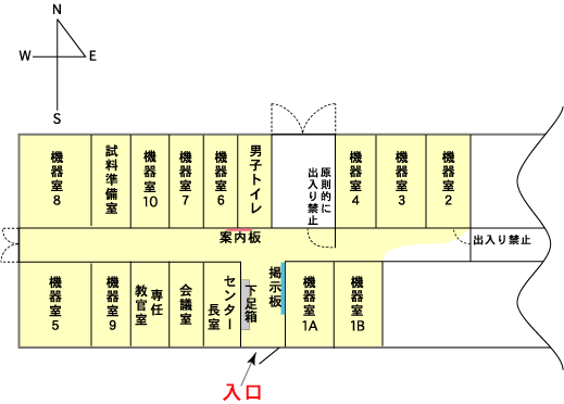 機器分析センター内は土足厳禁です。利用される方は南側入口より入館し、備え付けのスリッパを利用してください。
