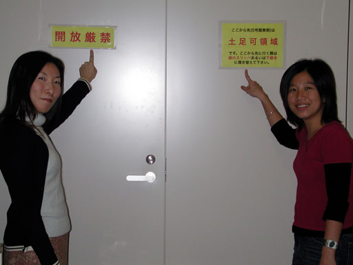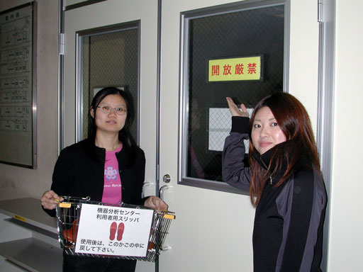 | 機器分析施設内は、埃の侵入を避けるため土足厳禁です。備え付けの茶色スリッパ、もしくは自分で上履きを用意してください。同じ目的で、全ての扉は開放厳禁です。埃の侵入は機器の不調を招きます。利用者各位は、特に注意してください。