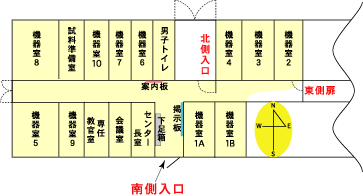 上記理由により、機器分析施設利用者は、南側入口(4号館側)を利用してください。入り口脇にスリッパを用意しています。(施設内マップはこちら) |