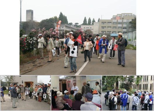 | 11月6日(月)、府中市観光協会主催の観光ガイドツアー「東京農工大学キャンパスの魅力を探る」で、約30名の府中市民が農学部キャンパスを見学しました。 当日は、本学学生ガイドの案内で、農場、サザンカコレクション、馬場、家畜病院など秋色に染まるキャンパスを楽しんでいただきました。 特に家畜病院では岩崎病院長から、馬場では馬術部顧問の田谷先生から直接施設を案内していただき、熱意のこもった説明に市民の方は真剣に聞き入っていました。ツアーではこのほか2号館のビオトープや府中市名木百選指定の樹木、学生食堂などを回り、学生ガイドの熱心でわかりやすい説明もあって、地元大学への親近感がさらに深まるひと時となりました。 |