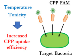 SUMMARY: To evaluate the applicability of cell-penetrating peptides (CPPs) as a biomolecule carrier with diverse bacterial strains, we evaluated and optimized factors that may play an important role in elevating CPP permeation efficiency. Based on our evaluation, we showed that 2 abiotic factors, temperature and tonicity promoted CPP permeation. Using our optimized conditions, we showed that CPP permeation was promoted in 9 out of 10 Enterobacteriaceae strains.