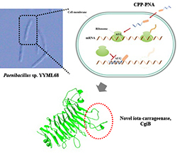 SUMMARY:Cell-penetrating peptide-peptide nucleic acid (CPP-PNA) conjugates were used in this research to characterize the function of hypothetical proteins within a hard-to-transform bacteria, Paenibacillus. In addition to the method being simple we successfully identified the carrageenase responsible for carageenan degradation in this bacterium.
