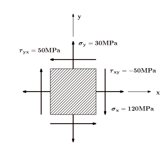 下図のような平面応力状態における、モールの応力円を描き、主応力とその方向を求めよ。