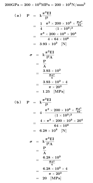 直径 20 mm、長さ 1 m の円柱がある。この柱のヤング率 E = 200 GPa とする時、 (a)一端は固定、他端は自由の柱の場合 (b)両端とも固定の柱の場合 のそれぞれについて、座屈荷重 P と座屈応力σを求めよ。