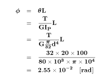 長さ 10 cm、直径 1 cm の中実丸軸に、ねじりモーメント 20 kNmm が加わる時、この軸の許容せん断応力を 40 MPa とすると、ねじれ角はいくになるか?ただし、この軸のせん断弾性定数 G = 80 GPa とする。