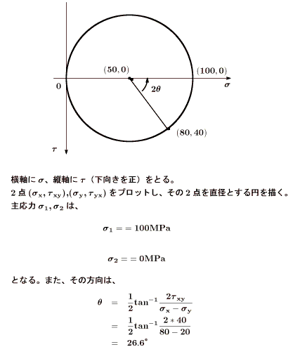応力がσx = 80 MPa、τxy = 40 MPa(τyx = 40 MPa)、σy = 20 MPa、σz = τxz = τyz = 0 の時、モールの応力円を用いて、主応力とその方向を求めよ。