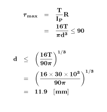 30 Nm が加わっている中実丸軸に生じる応力を 90 MPa 以下にするには、直径はいくらにすればよいか?