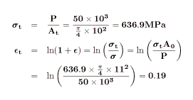直径 11mm の棒を引張ったところ、直径が 10mm になり、その時の荷重が 50kN であった。この時の真応力と対数ひずみを求めよ。