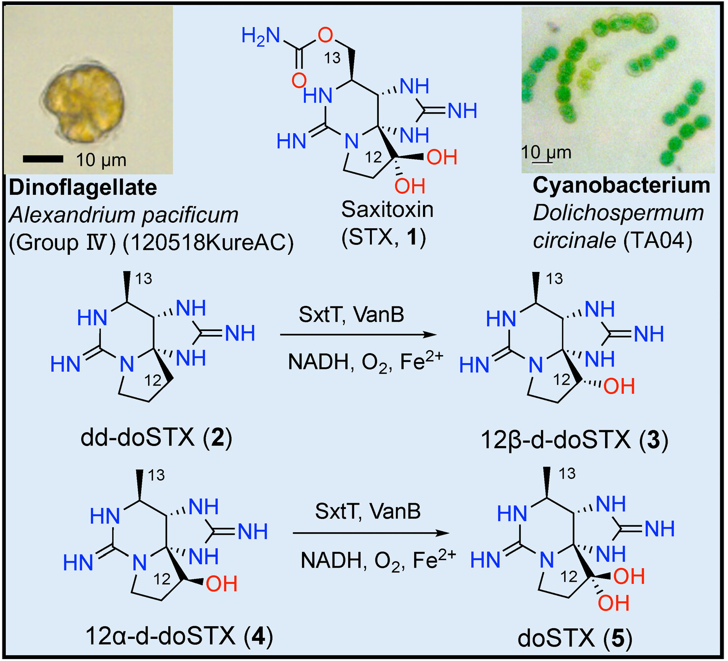 [216] Synthesis and Identification of decarbamoyloxySaxitoxins in Toxic Microalgae and their Reactions with the Oxygenase, SxtT, Reveal Saxitoxin Biosynthesis